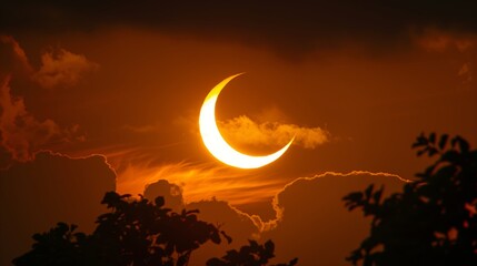 Fiery Crescent Moon over Trees at Sunset