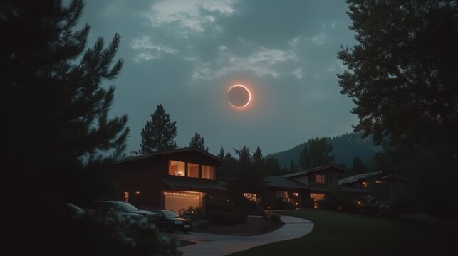 Partial solar eclipse observed over suburban neighborhood at twilight with clouds providing a dramatic backdrop