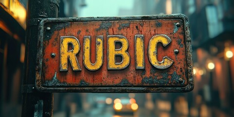 rusty orange metal street sign with yellow weathered letters spelling a partial word in an urban nighttime setting with blurred backgrounds