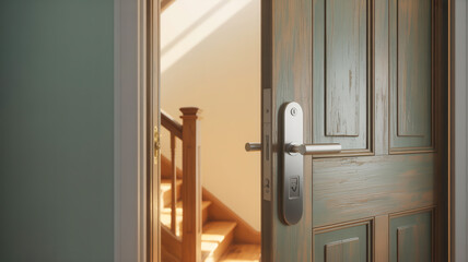 A modern door with a sleek metal handle, partially open to a bright room. Clean lines and minimalist design.