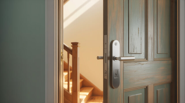 A close-up photograph of a partially open wooden door with a silver metal handle and lock mechanism .
