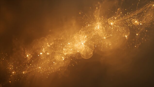 Glowing golden particle cluster forming diagonal streamer in dark amber backdrop, filaments, bokeh