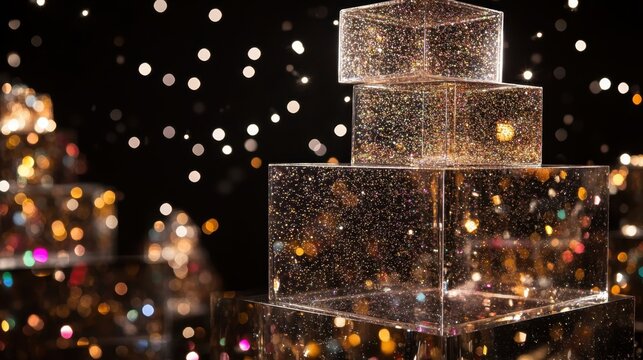 Stacked translucent acrylic cubes filled with shimmering glitter particles and blurred bokeh lights creating a festive and glamorous display