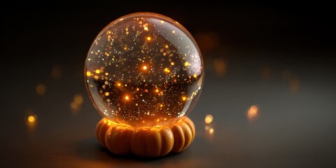 Glowing orb filled with golden particles on a festive pumpkin base soft bokeh lights