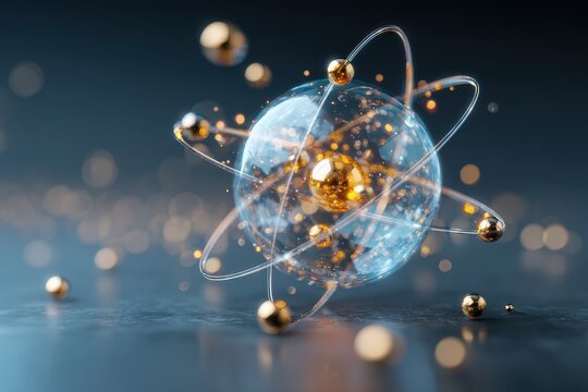 Abstract representation of an atom, surrounded by a digital particle field.