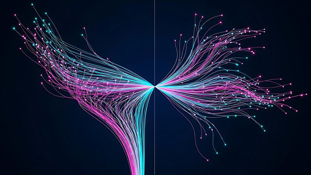 Pink and blue glowing strands with light particles on dark background abstract bright