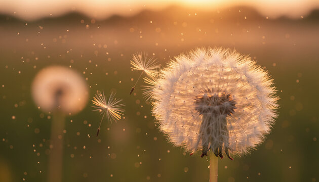 Dandelion seeds blowing in wind with pollen particles and sunset light