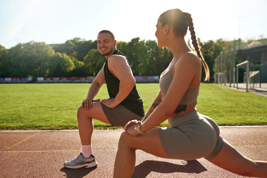 Side view of fit senior man and woman in static lunge pose strengthening leg muscles, while working out together under shade pavilion at autumn city park