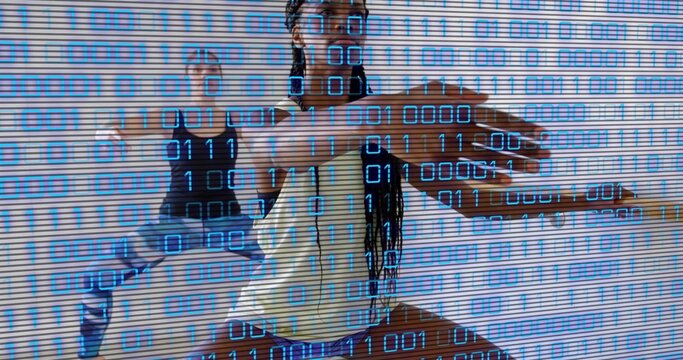Dance class practicing lunges with raised arms and digital data overlay in studio
