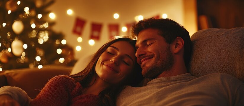 Happy couple enjoying cozy moments together in a festive living room with warm lights and holiday decorations