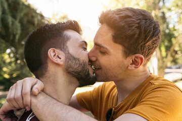 Happy ethnic multiracial Hispanic married couple outdoors cuddle on date in autumn park smiling partners girl hugging guy by shoulders man holding piggyback woman on back romantic date love cuddling