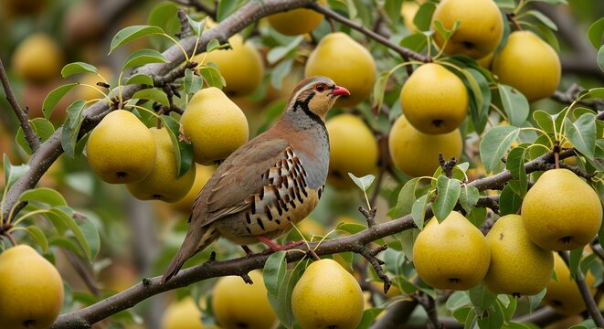 Partridge Bird on Pear Tree Branch with Yellow Fruit