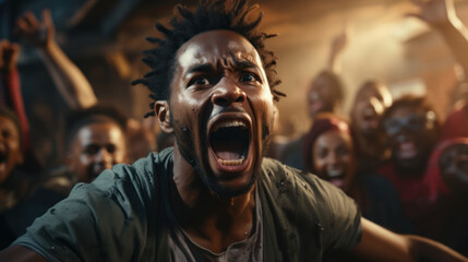 Portrait of a young african american man screaming in a crowd of drunk people.