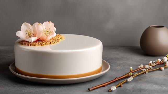 Easter russian paskha cake with white icing and gingerbread birds on table with willow branches in a minimalist setting