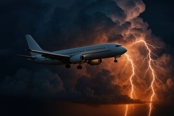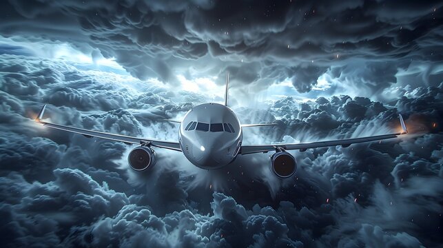 Airliner Flight Through Storm: An airliner fearlessly navigates through a dramatic storm, its engines blazing against the backdrop of swirling dark clouds and a flash of lightning.