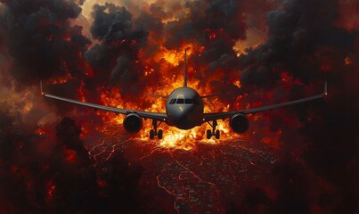 A captivating view of a passenger jet navigating through thick smoke and flames as it approaches a fiery landscape, illustrating the tension between aviation and nature's wrath.