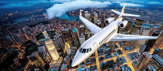 Business jet flying above clouds in dramatic sunset light. Wings of splendor, navigating through clouds, a stunning tableau.
