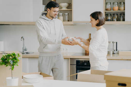 Horizontal shot of smiling couple unpack cardboard boxes in new kitchen, man passes plates to woman, placing dishes in cupboard, surrounded with moving packages in own bought or rented apartment