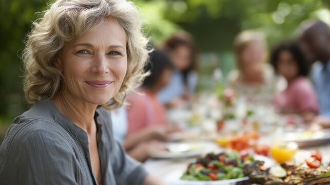 A middle aged woman sits at an outdoor table with a multiethnic family group her gaze meeting the camera others chatting and passing dishes plates of grilled vegetables and
