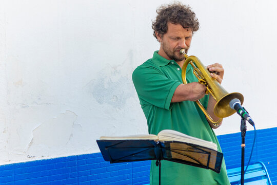 Electric blue stage lights silhouette a passionate trumpet player and jazz band in a smoky vintage club captured from the crowd during a live show