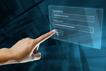 a woman hand sign in her login and password on a screen