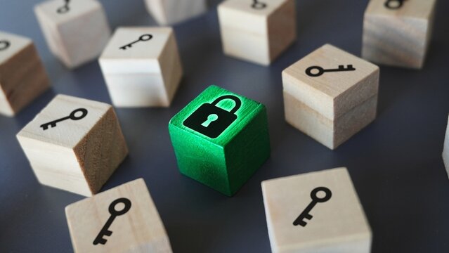Digital lock icons displayed on a screen with red and blue colors showing security features and options for password protection and access control settings