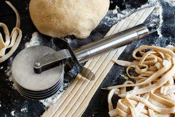 Homemade pasta making with dough cutter in kitchen