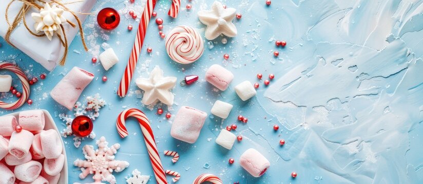 Christmas or New Year background featuring a candy caramel cane and marshmallow on a pastel blue surface Concept of the Christmas holiday Flat lay top view copyspace