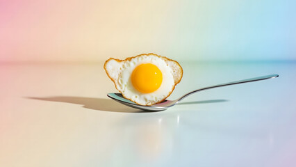 Breakfast with bacon, fried egg and sausage on a white dish pastel background. Copy space image. Place for adding text and design
