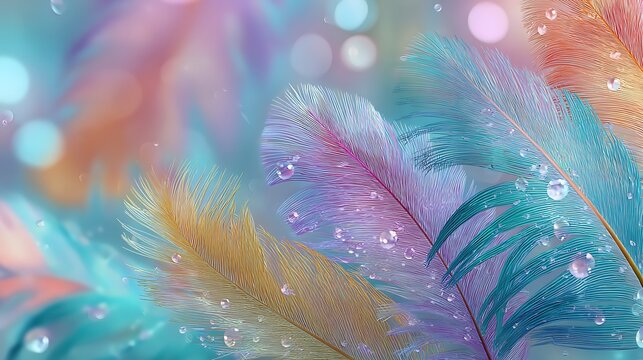 Colorful feathers with water droplets on pastel background pastel colors soft