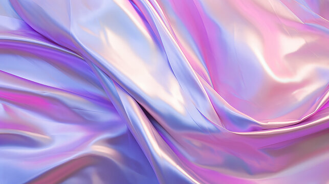 Close-up of ethereal pastel neon pink, purple, lavender, mint holographic metallic foil wavy background