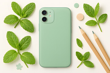 Minimalistic green aesthetic with leaves and spheres on soft background