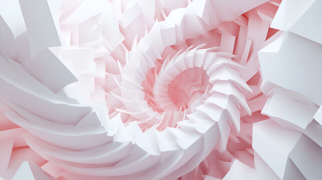 A captivating abstract spiral of geometric shapes creates a mesmerizing, three-dimensional vortex with soft, light-infused pastel tones.