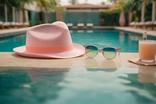 hat, glasses and drink on the edge of a pool in a hotel, concept of relaxing on summer vacation, atmosphere in pastel colors, space for text