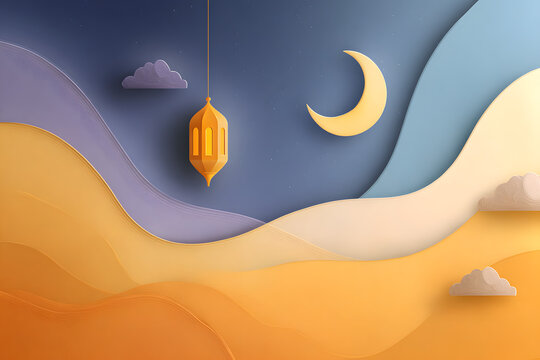 abstract soft peach shapes in pastel tones with subtle hand drawn crescent and lantern on deep blue to cream sky