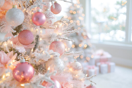 Festive decorated Christmas tree with gifts box. Merry Christmas and Happy new year. Holiday background soft pastel colors with gift surprise under the xmas tree
