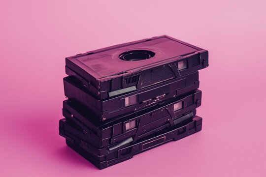 Stack of vintage VHS tapes with colorful pastel labels on pink and purple gradient background, nostalgic retro entertainment concept