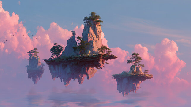 Futuristic aerial metropolis island with neon waterfalls at sunset