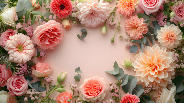 Colorful floral wreath forming open circle with lush foliage and vibrant blossoms