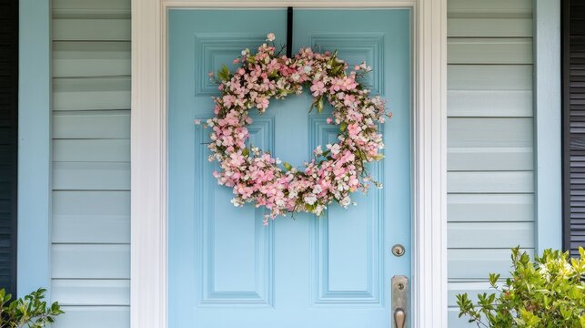 Front door entrance adorned with a decorative pastel colored spring wreath