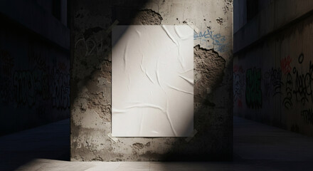 A blank white poster is affixed to a weathered, graffiti-covered concrete wall in a dimly lit urban alleyway, illuminated by a dramatic shaft of light.