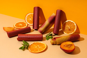 waffle cone with fruit roll up. Fruit pastille top view. Vegan homemade sweets
