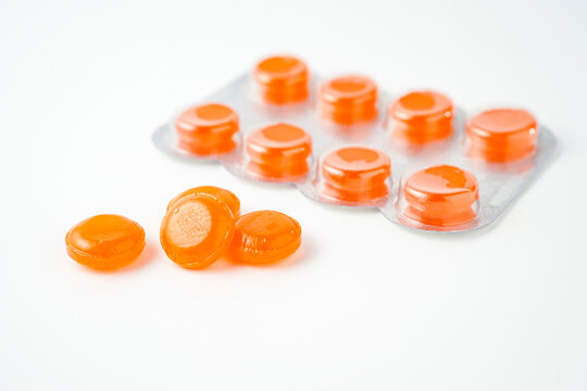 cough sore throat pastille colorful with leaf arrangement flat lay style on background white