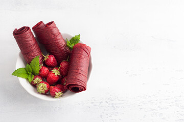 Homemade strawberry pastille with fresh strawberries on a light blue background