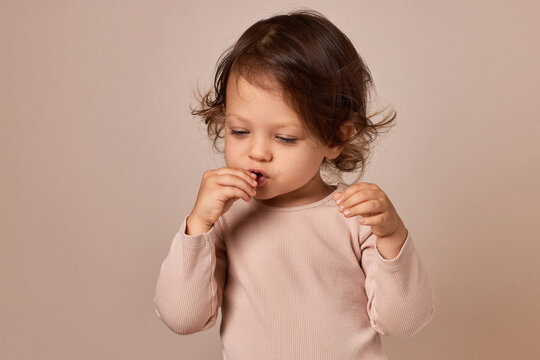 smiling child girl holding fruit pastille on beige background. healthy baby food.