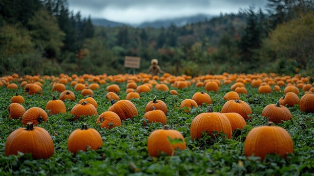 A vibrant pumpkin patch filled with numerous pumpkins of varying sizes, set against a cloudy landscape with blurred trees in the background.