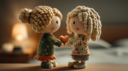valentine day in patchwork style concept. Knitted dolls with hearts, symbolizing love and companionship.