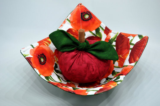 Still life of handmade dolls with spools of thread and a parent's day card on a quilted surface