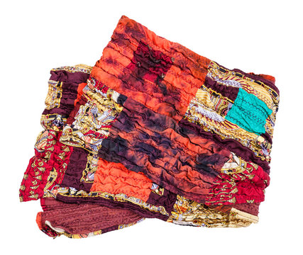 part of stitched red brown patchwork scarf isolated on white background