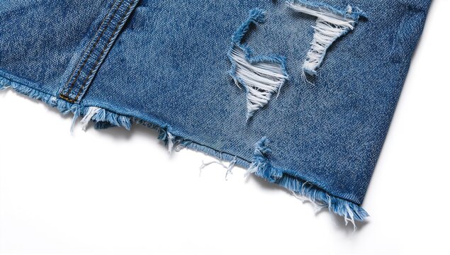 Blue Denim Jeans with Ripped and Torn Details, Frayed Edges, and Patchwork on White Background with Space for Text